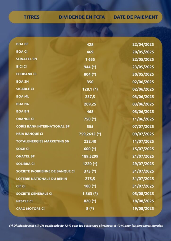 NSIA Finance vous informe des montants et des dates de paiement des dividendes approuvés par les Assemblées Générales au titre de l’exercice 2024. À noter : (*) Les montants indiqués sont exprimés en dividendes bruts. L’IRVM (Impôt sur le Revenu des Valeurs Mobilières) applicable est de 12 % pour les personnes physiques et 10 % pour […]