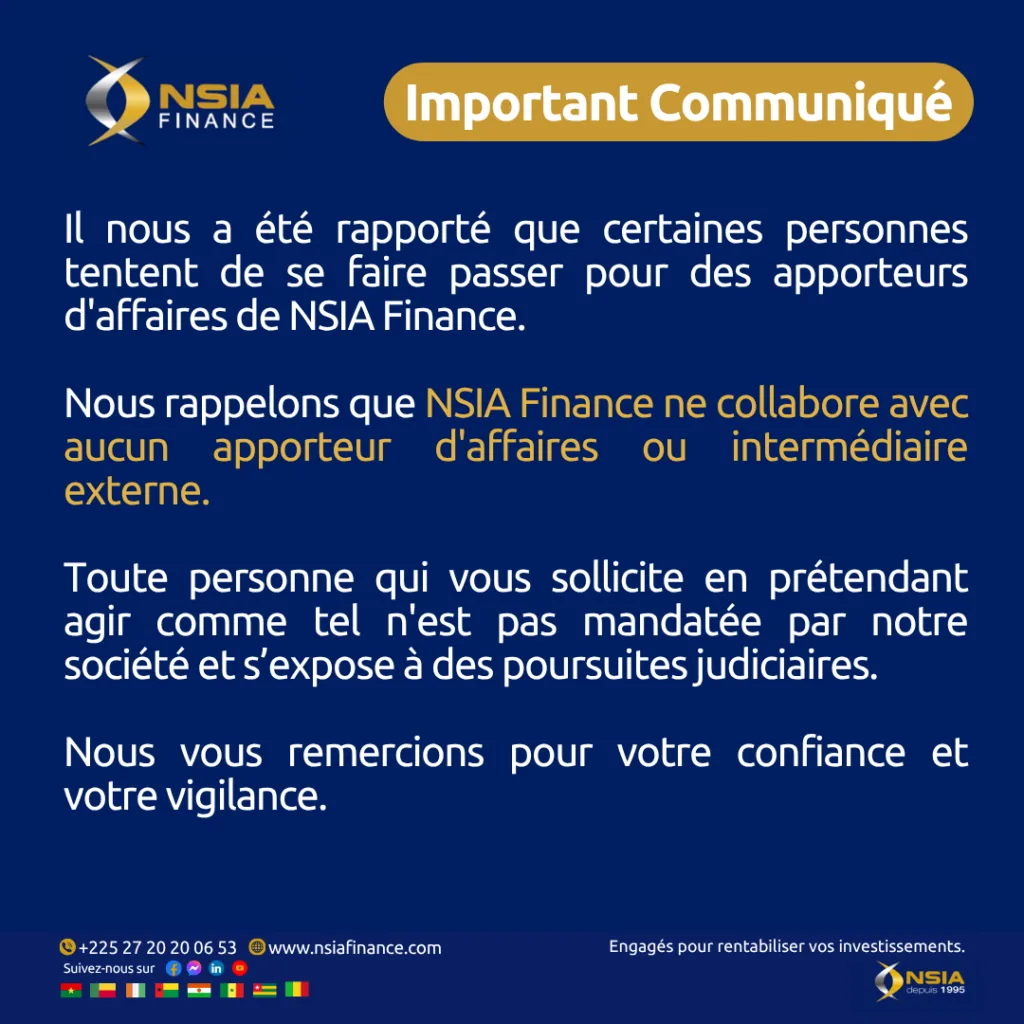 Il nous a été rapporté que certaines personnes tentent de se faire passer pour des apporteurs d’affaires de NSIA Finance. Nous rappelons que NSIA Finance ne collabore avec aucun apporteur d’affaires ou intermédiaire commercial externe. Toute personne qui vous sollicite en prétendant agir comme tel n’est pas mandatée par notre société et s’expose à des poursuites judiciaires.